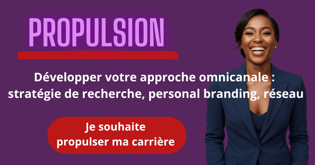 Le coaching Propulsion est un programme immersif de 12 heures, réparti sur deux ou trois mois, qui va au-delà des fondamentaux en renforçant votre force de conviction, votre personal branding et votre plan d’action post-coaching, pour transformer votre recherche d’emploi en véritable moteur de carrière.